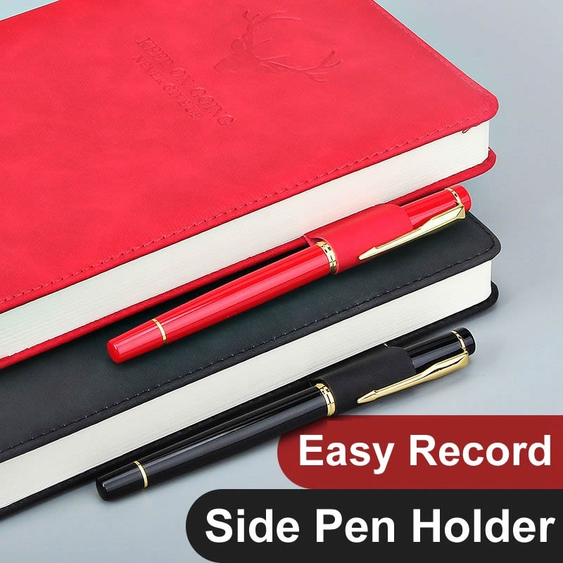 Notebook A5 berdesain premium dengan cover kulit sintetis elegan. Dilengkapi hingga 200 halaman, cocok untuk kantor, sekolah, dan kuliah. Tersedia pilihan slot pulpen.